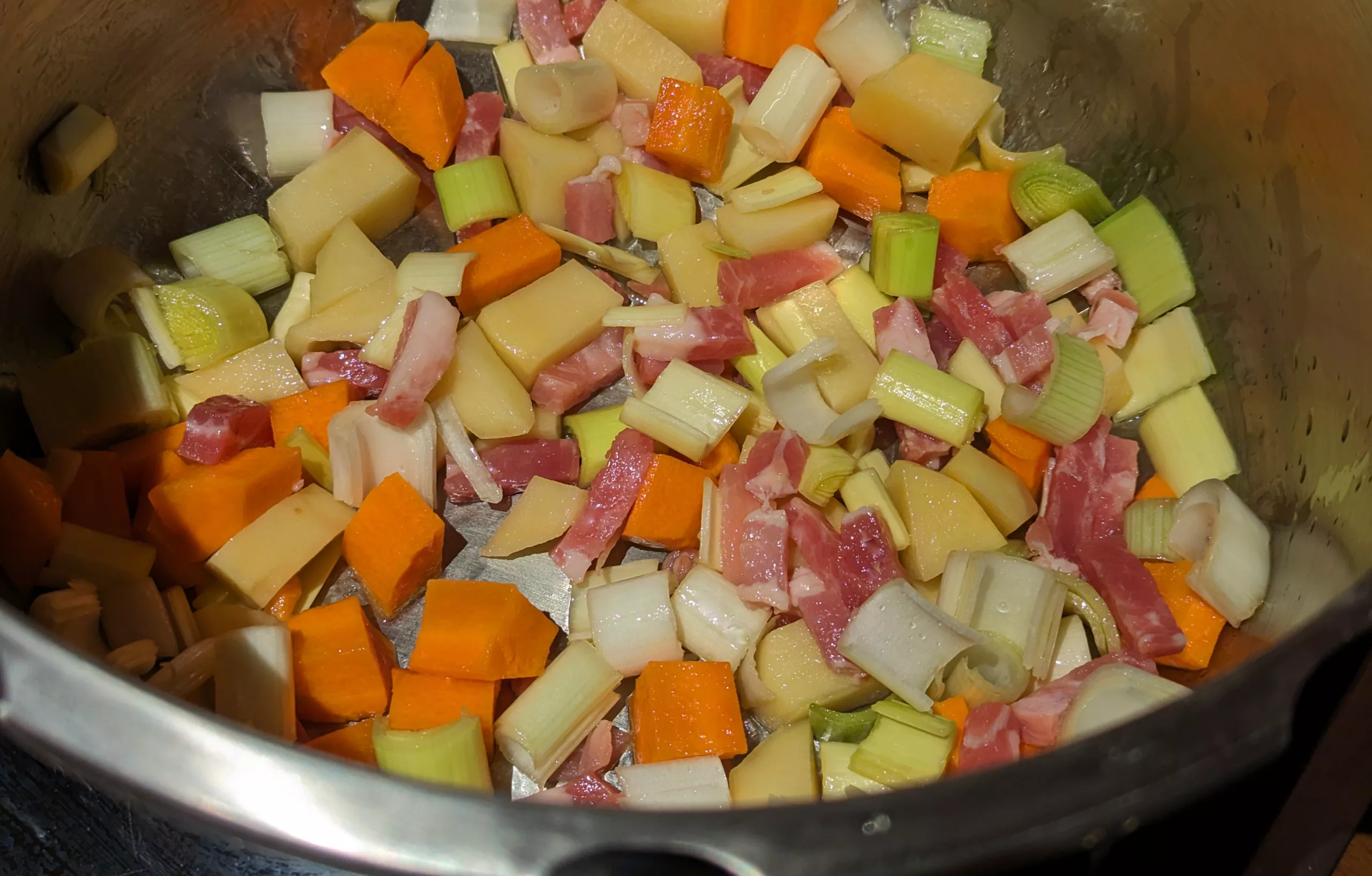 Rajouter ensuite, les morceaux de pomme de terre, de carotte, de poireau et d'ail. Compléter avec les lardons fumés.