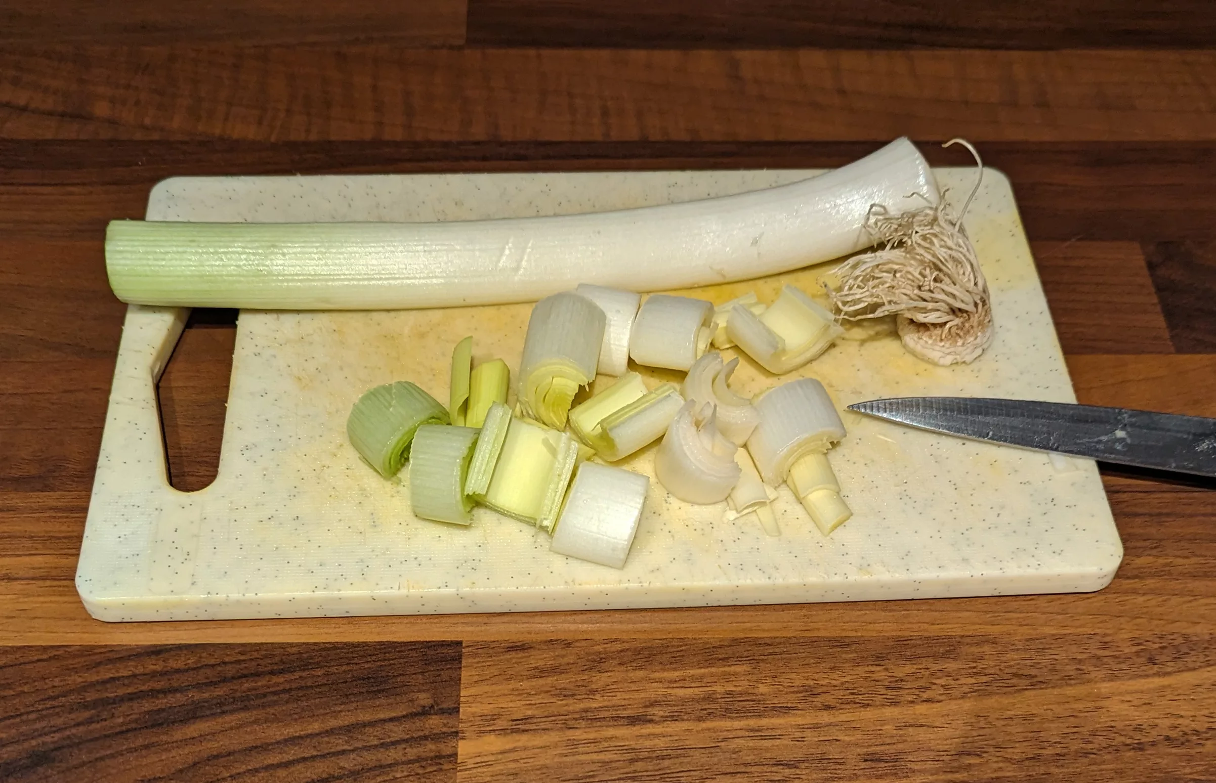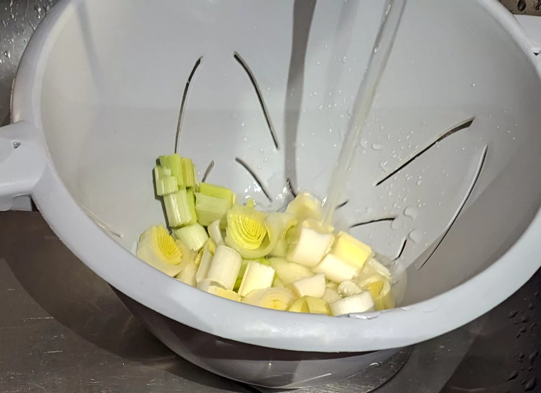 Puis, couper les racines du blanc de poireau. Le fendre en deux dans le sens de la longueur et le découper en petits morceaux.