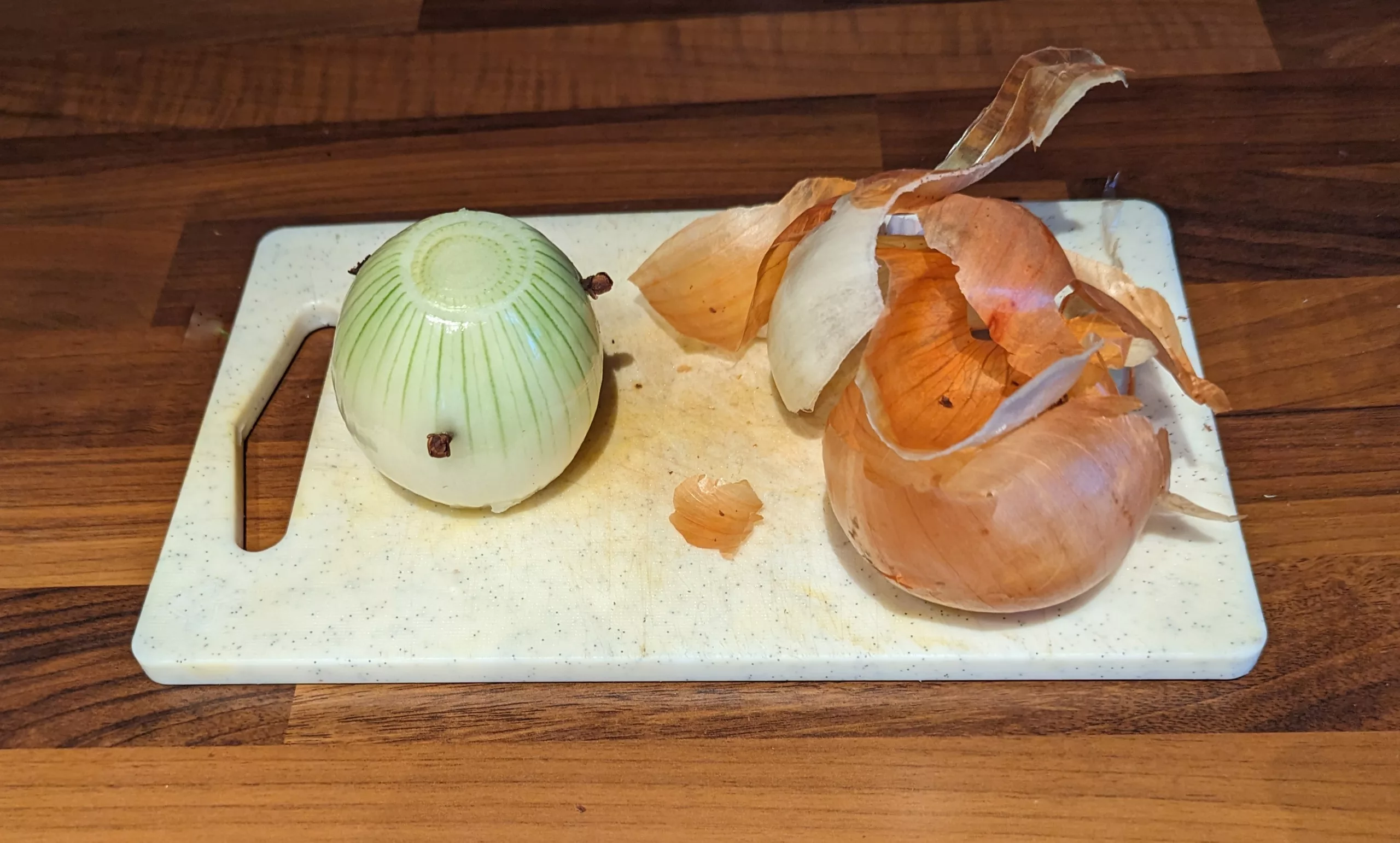 Ensuite, éplucher l'oignon jaune et planter dedans les clous de girofle.