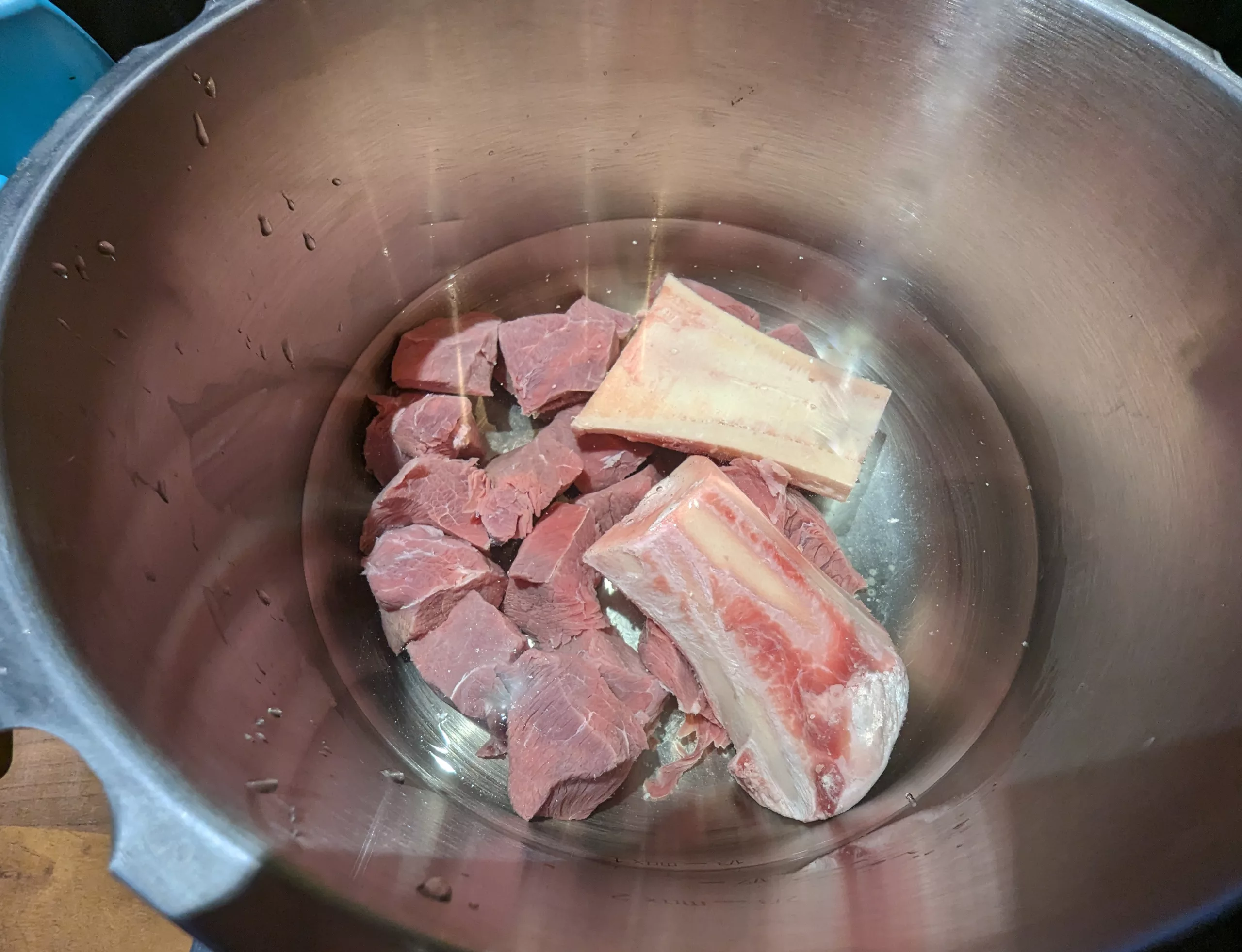 Faire cuire la viande 5 minutes puis enlever l'écume qui se trouve en surface. Cela enlèvera le goût amère de votre viande et évitera aussi de boucher la soupape de votre cocotte minute.
