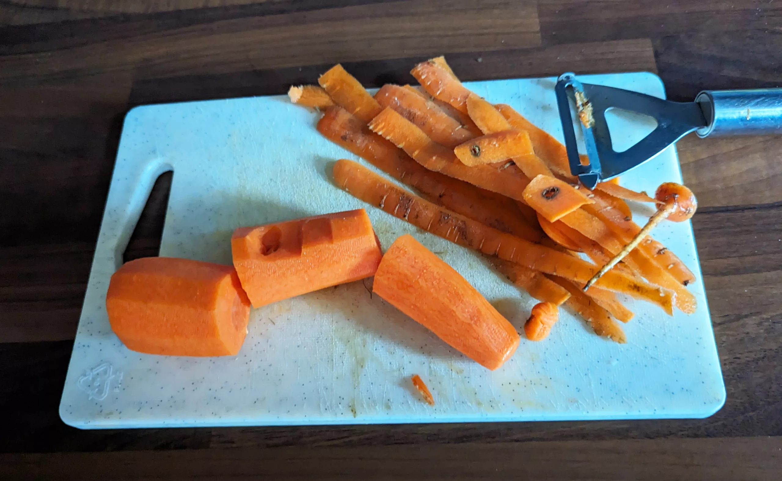 Puis, éplucher les carottes avec un économe et les couper en gros morceaux.