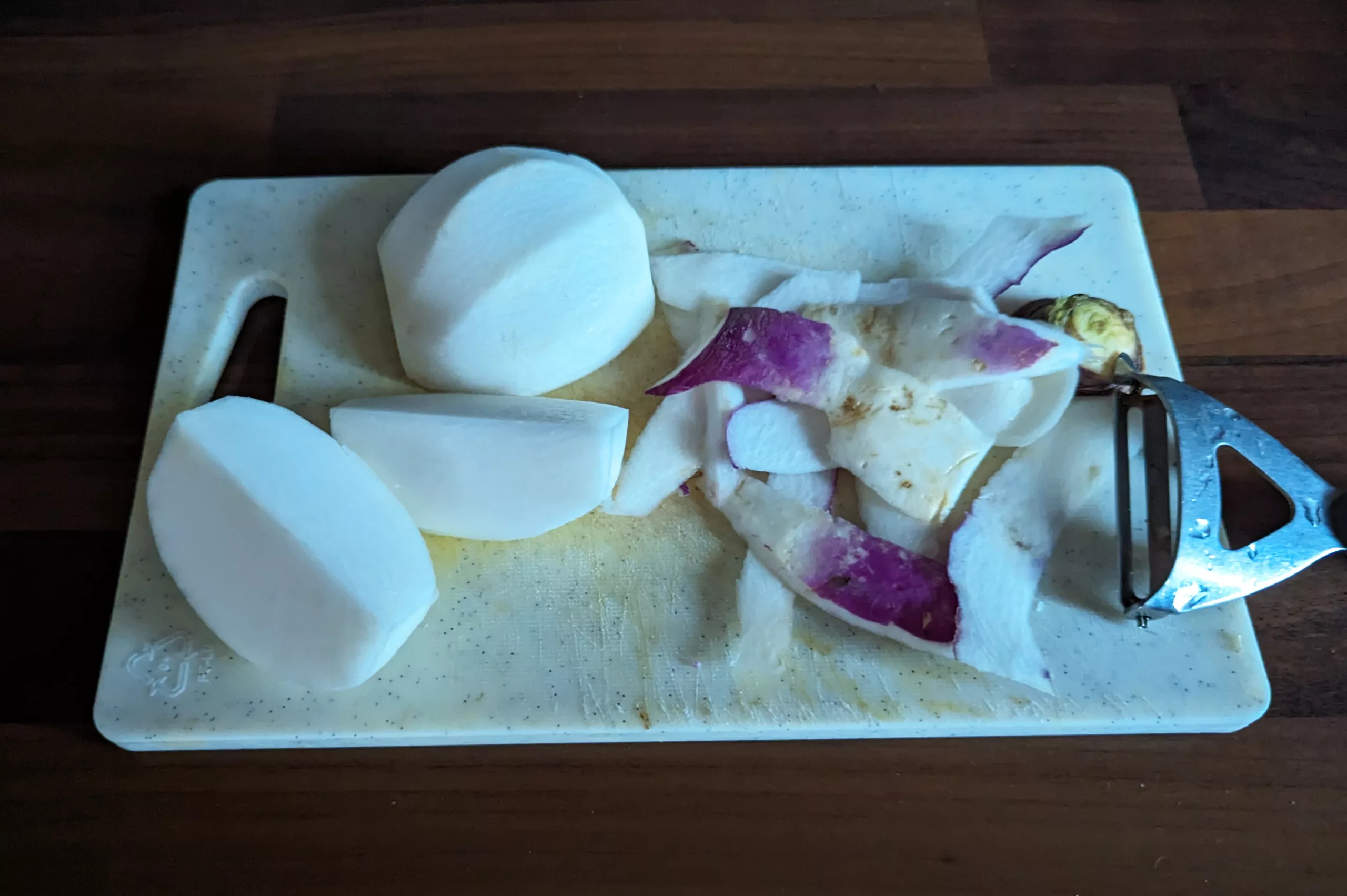 Poursuivre en enlevant la peau des navets boule d'or et en les découpant en quatre.