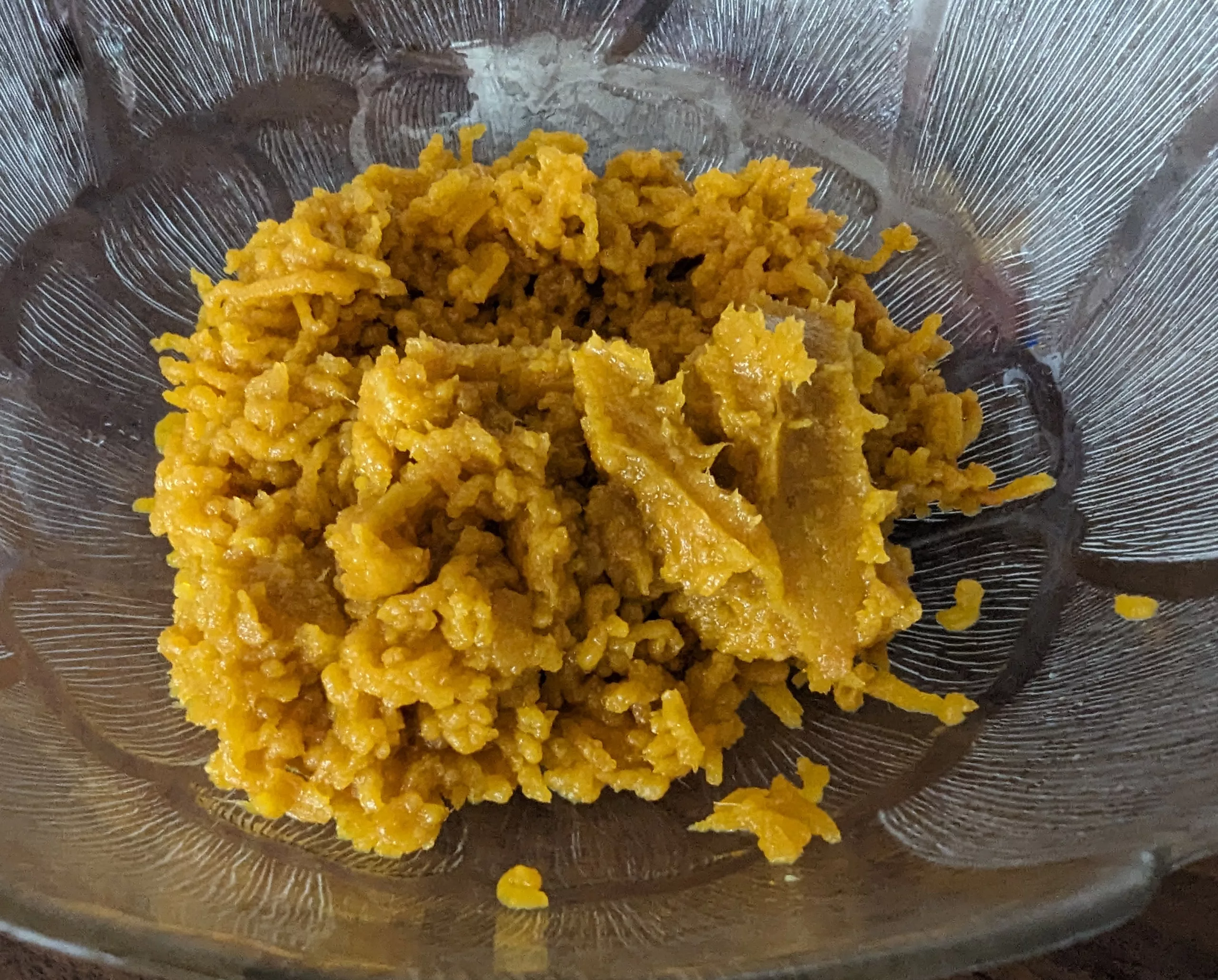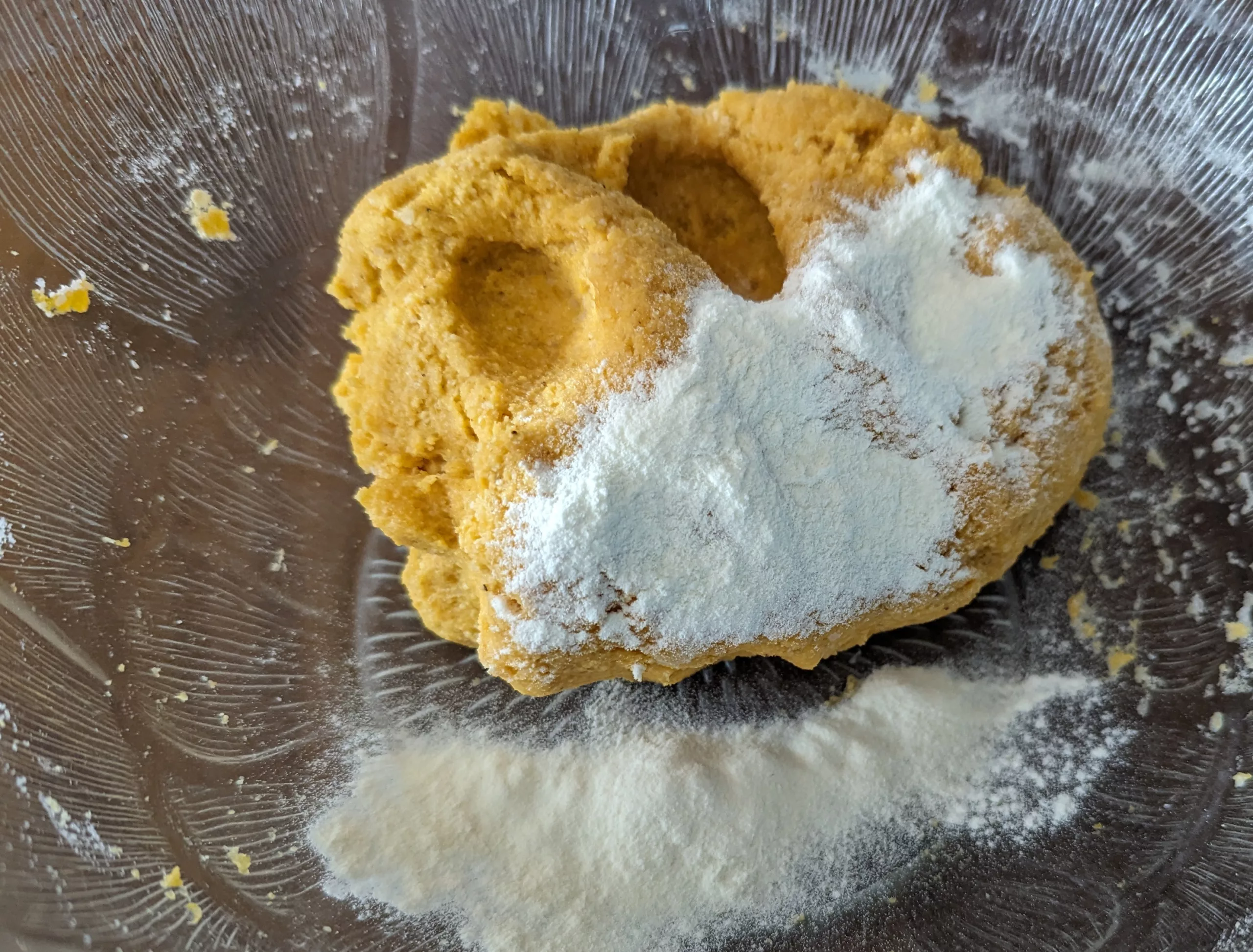 Mélanger et recommencer jusqu'à l'obtention d'une pâte non collante. Il vous restera un peu de farine ou il faudra en rajouter un peu selon l'humidité initiale de votre purée de patate douce.