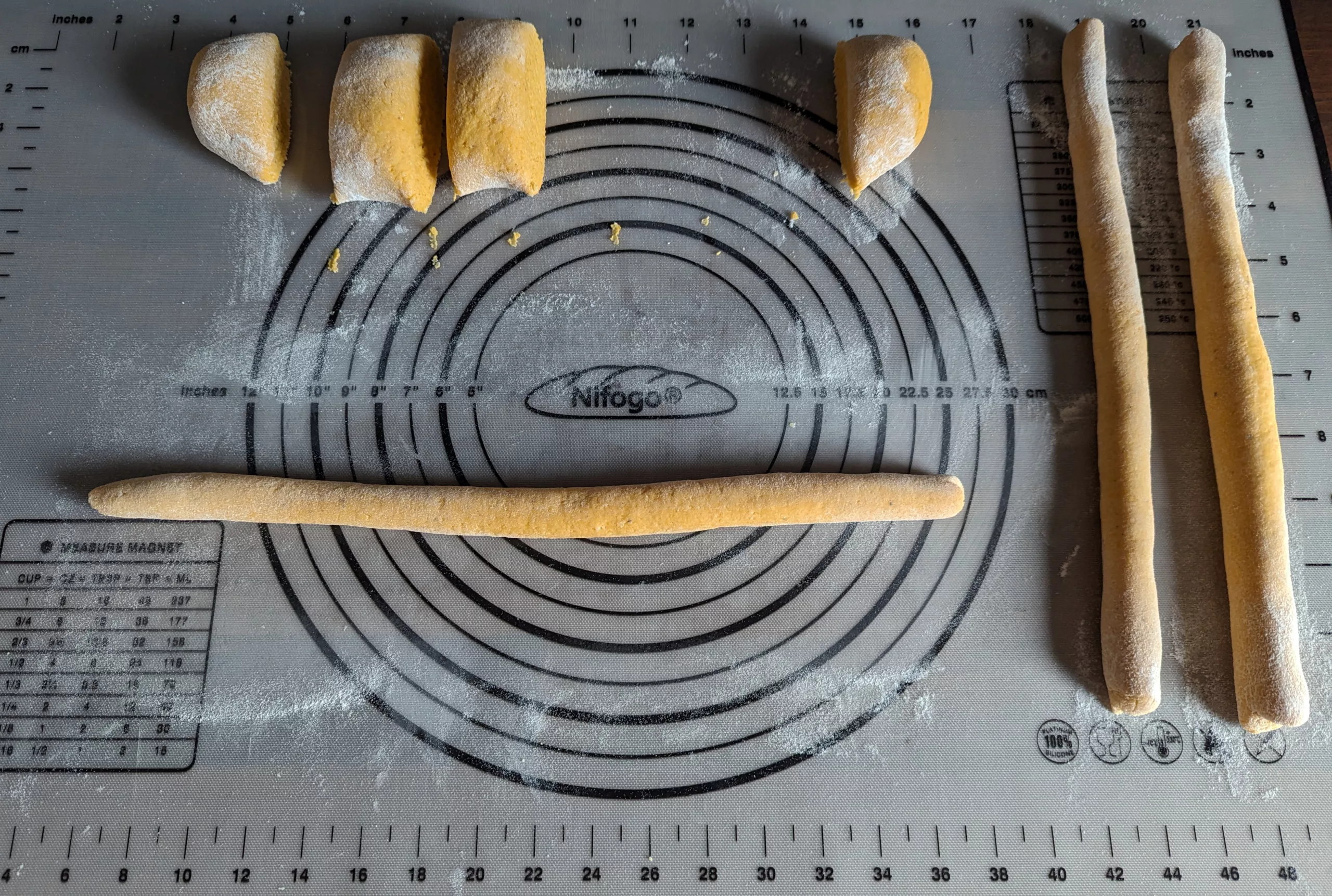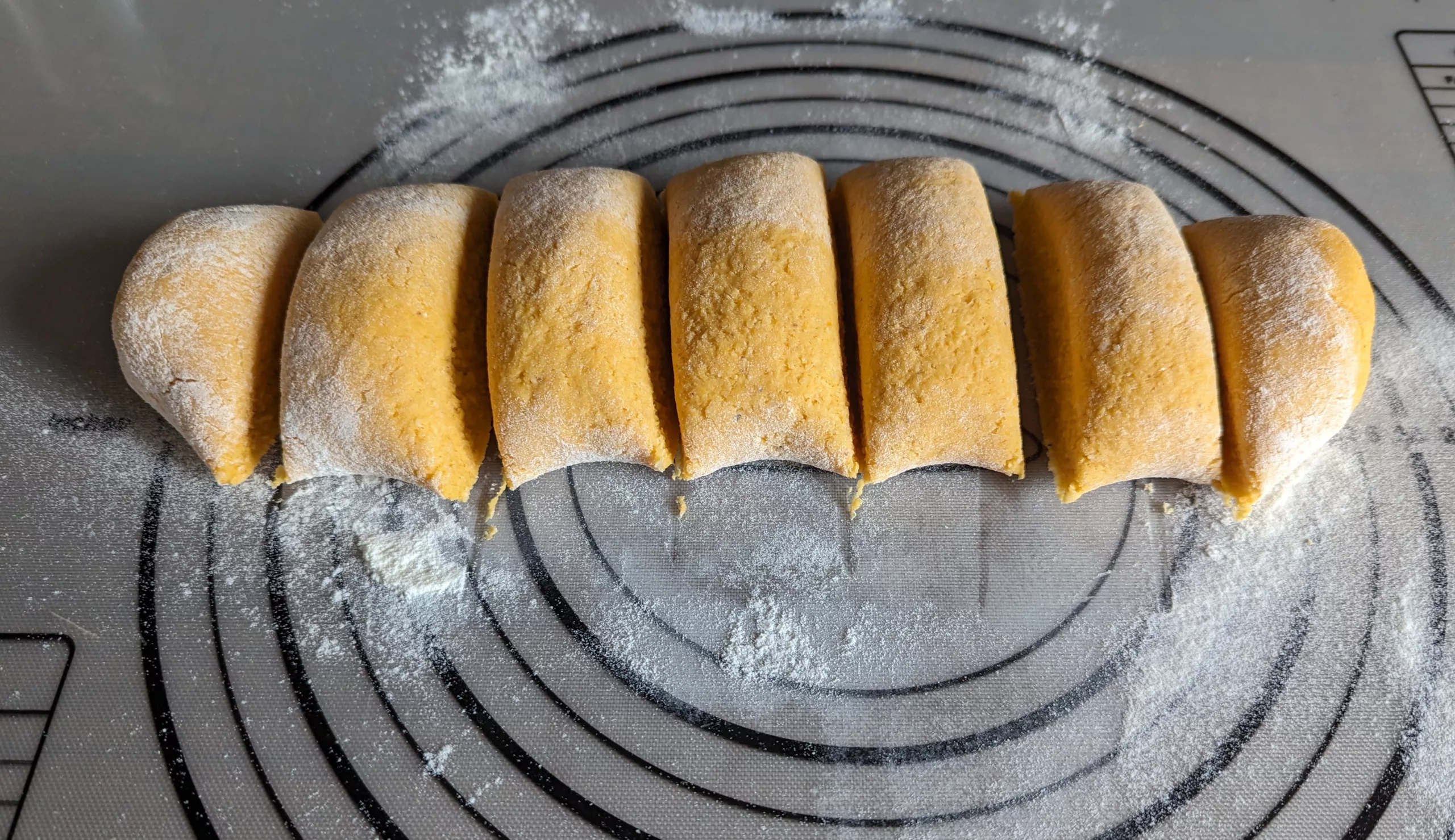Prendre une tranche et la rouler avec les mains pour faire un long boudin (de 1 à 2 centimètres de diamètre environ. Cela dépendra de la taille des gnocchis souhaitée).
