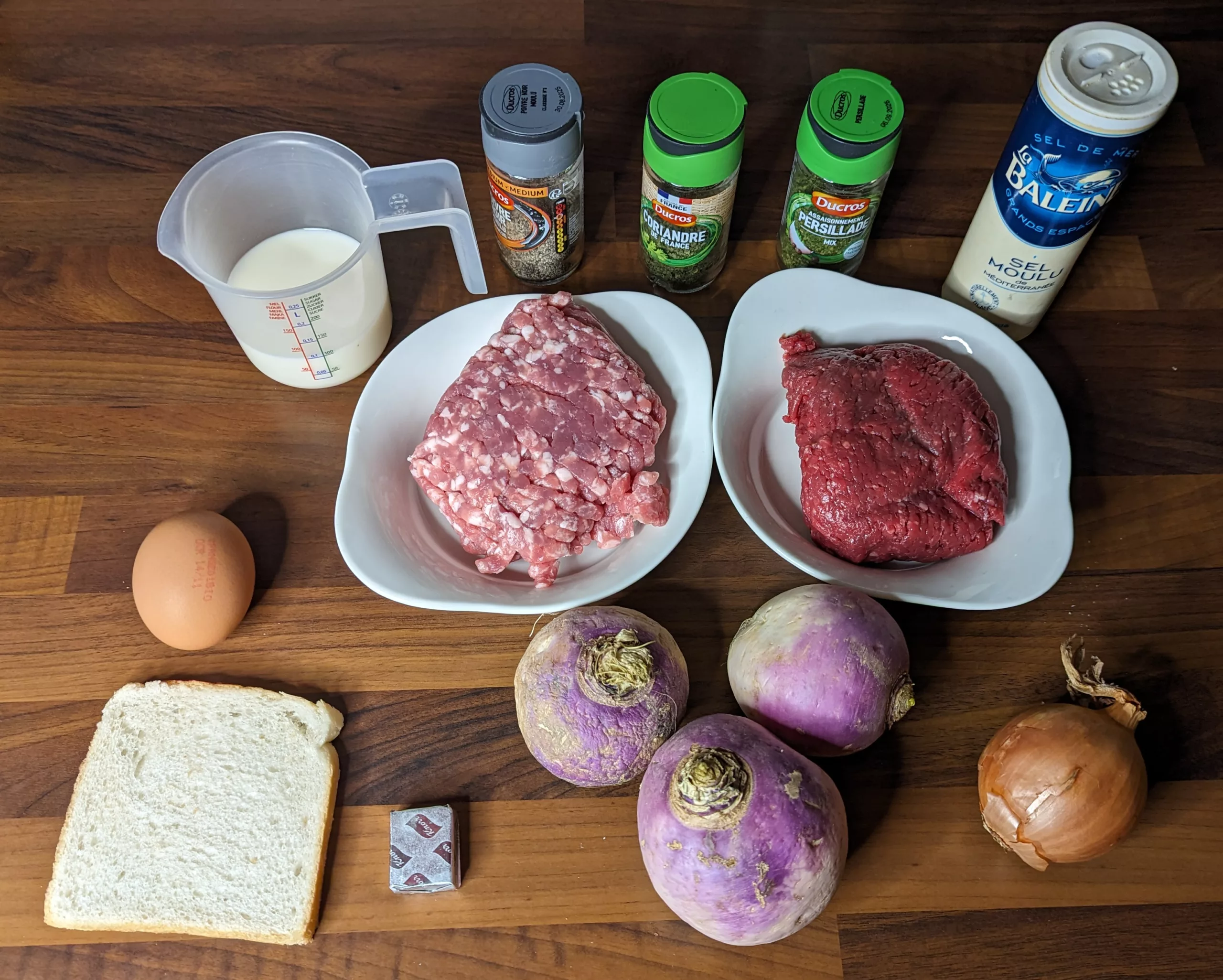 Dans un saladier, mettre l'échine de porc, le bœuf, l'œuf, l'oignon jaune et le pain de mie après l'avoir bien essoré. Compléter avec le sel, le poivre, le persil et la coriandre.