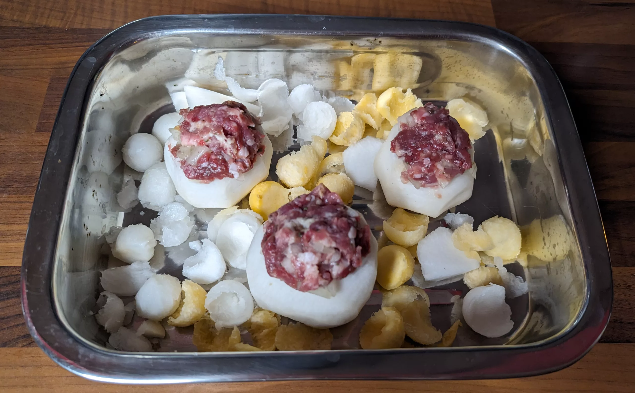 Puis, mettre les navets farcis dans un plat allant au four. Ajouter au fond du plat à gratin la chair des navets enlevée précédemment.