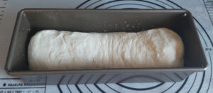 La dégazer avec le poing et sur un plan de travail enfariné, faire un rectangle de 27 cm (pour un moule de 25 cm de long) * 30 cm avec les doigts