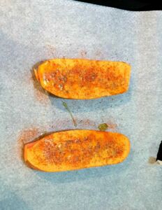 Préchauffer le four à 180°C. Pendant ce temps, rincer la patate douce en brossant sa peau, la découper en deux puis la quadriller à l'aide d'un couteau sans traverser la peau.Personnellement, j'avais fait 3 traits dans le sens de la longueur et 7 traits dans le sens de la largeur. Puis la positionner sur une feuille de papier sulfurisé sur une plaque allant au four.