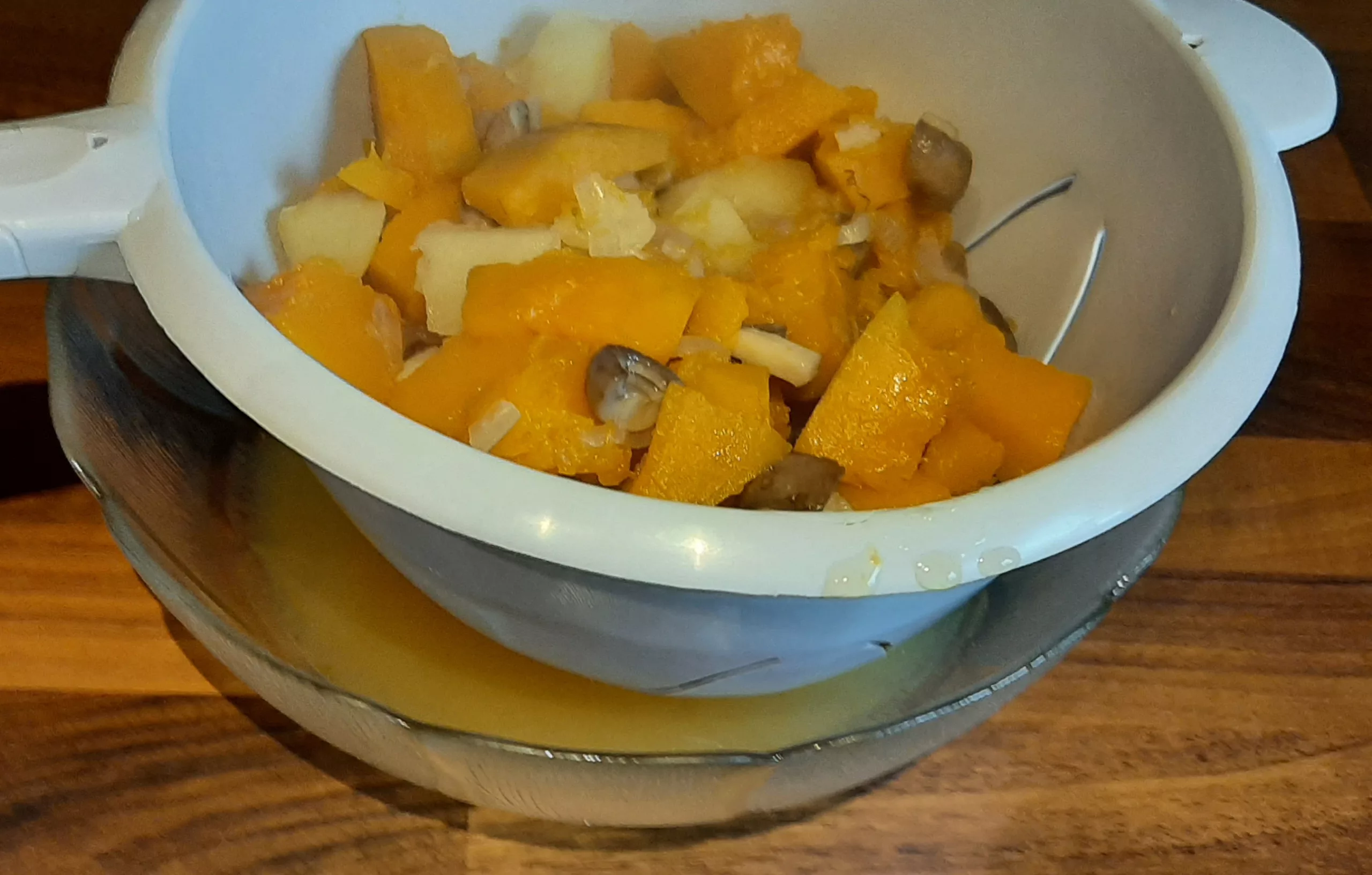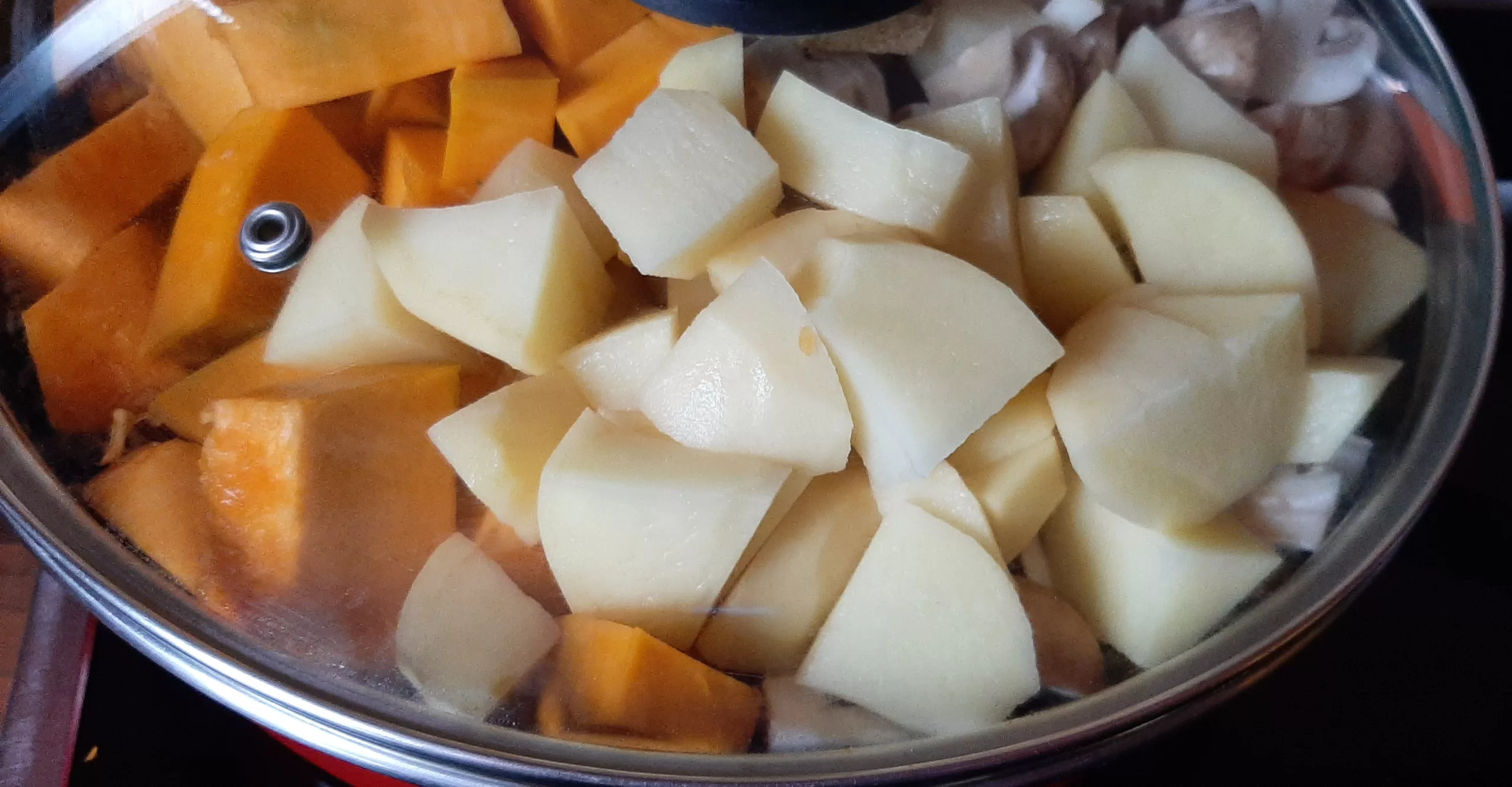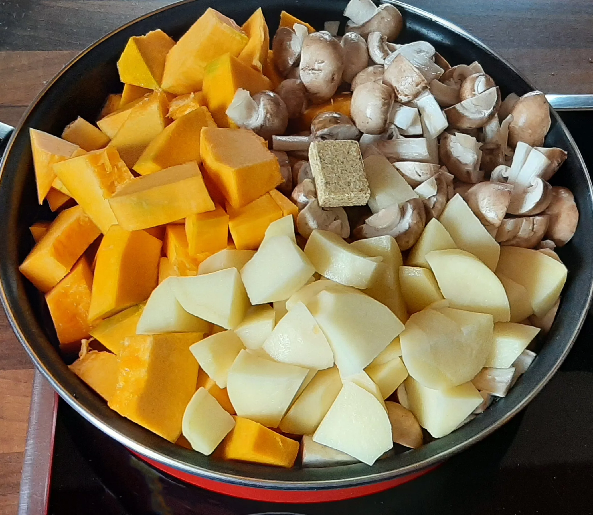 Rajouter l'eau, le cube de bouillon de légumes les morceaux de potimarron vert, de champignons de Paris et de pommes de terre.