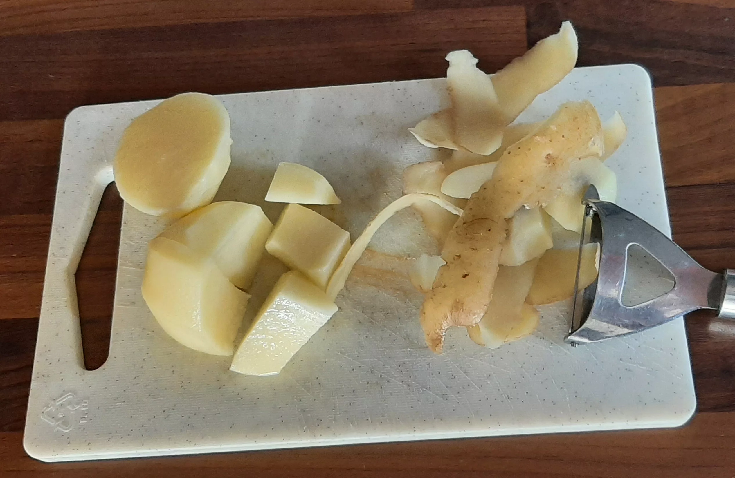 Eplucher les pommes de terre avec un économe puis les couper en gros dés.