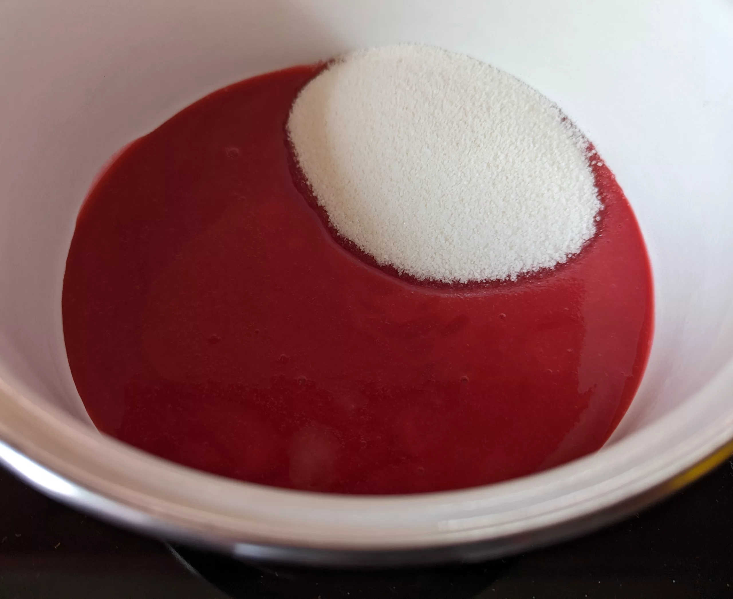 Peser le jus obtenu et préparer 60% du poids en sucre. Me concernant, comme j'ai obtenu 300 gr de jus, j'ai utilisé 180 gr de sucre. Ensuite, dans une casserole, mettre le jus des groseilles, le sucre et le jus du citron jaune.