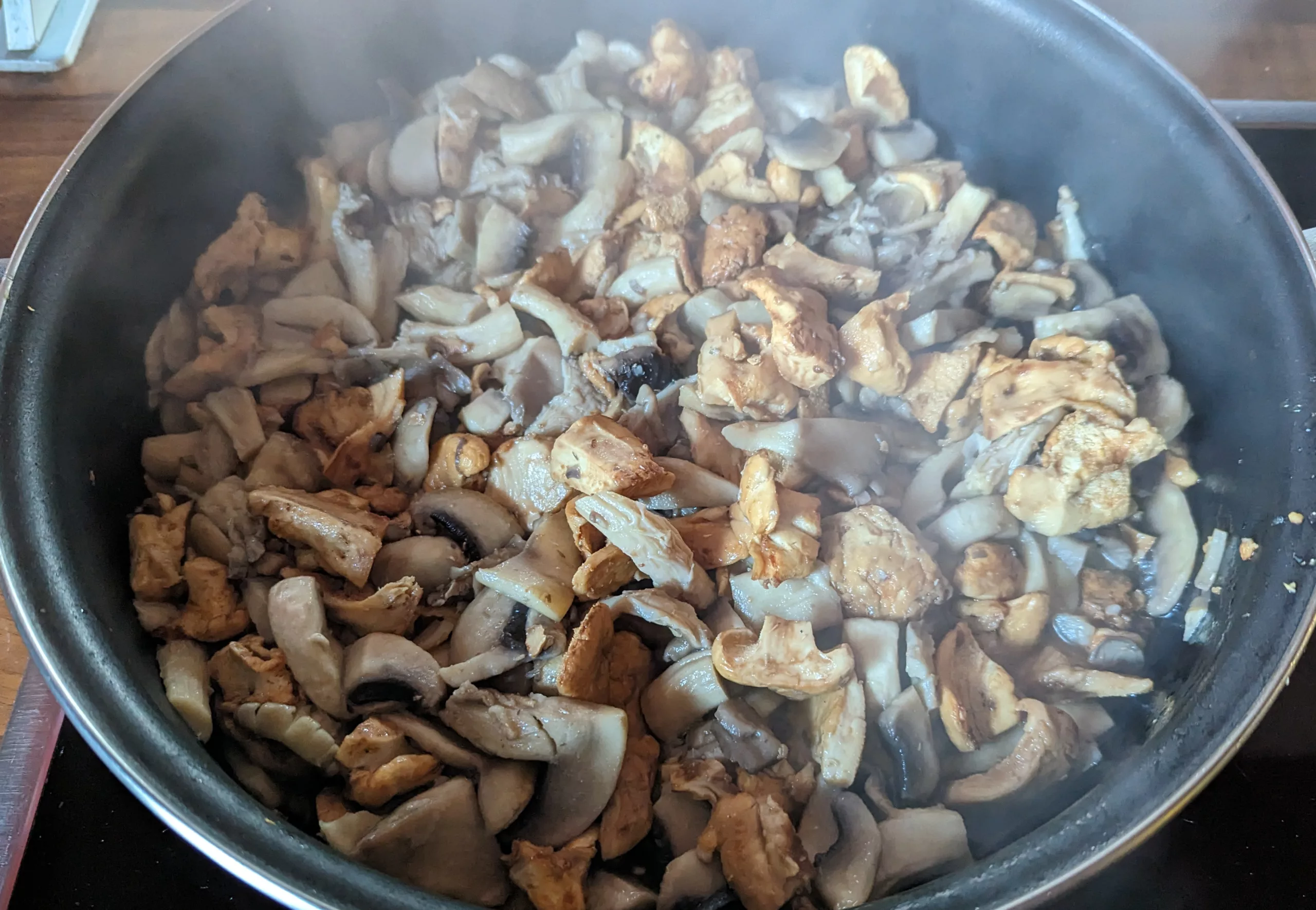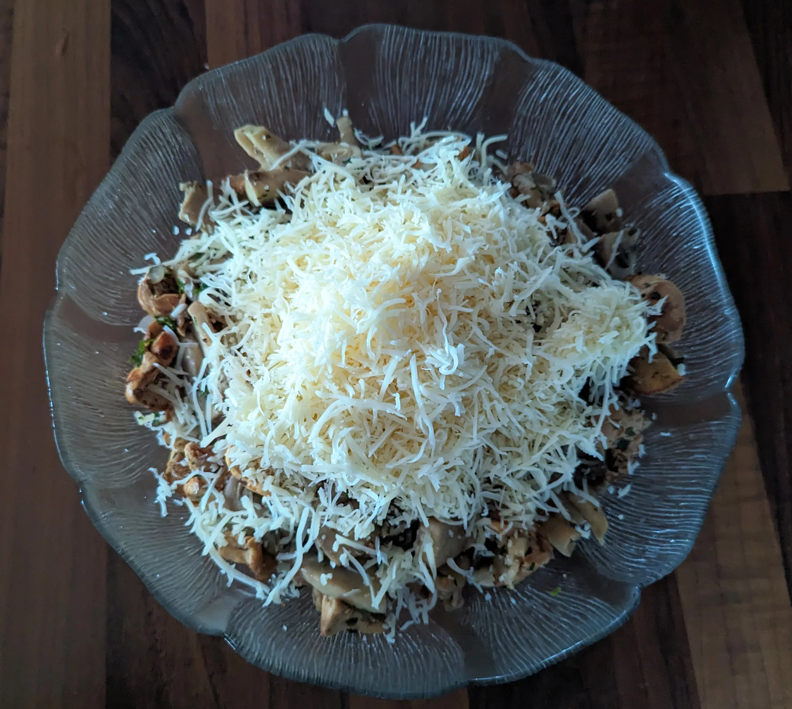 Une fois la garniture de champignons refroidit, ajouter le gruyère râpé et mélanger. Préchauffer le four à 180°C.