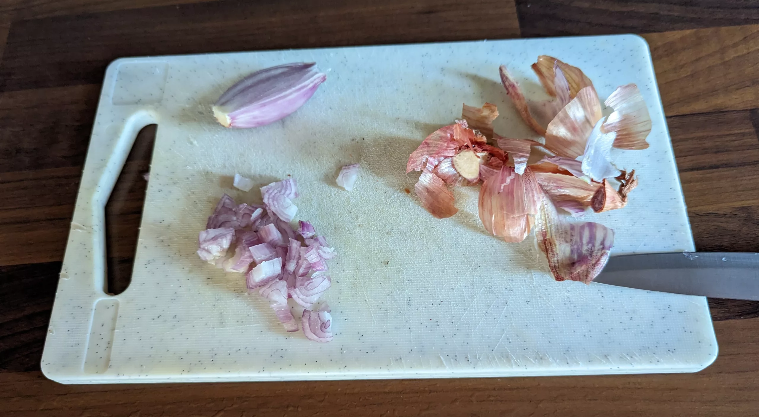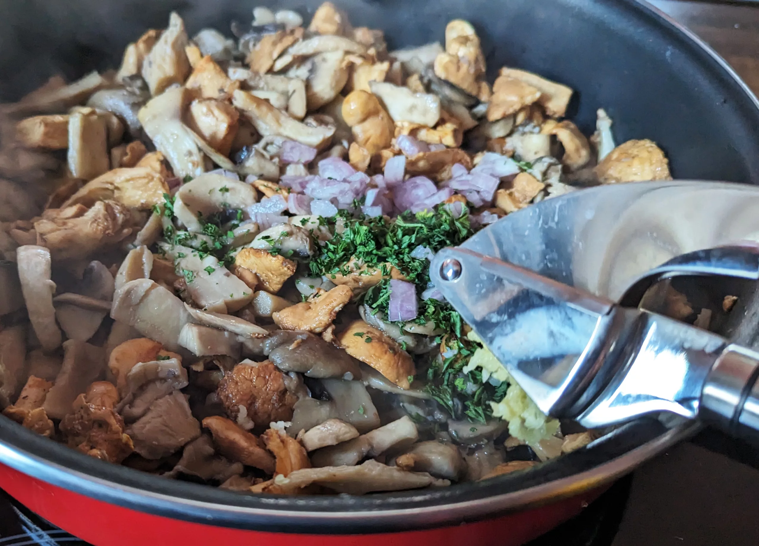Ensuite, rajouter l'échalote, le persil, le sel, le poivre et presser les gousses d'ail.