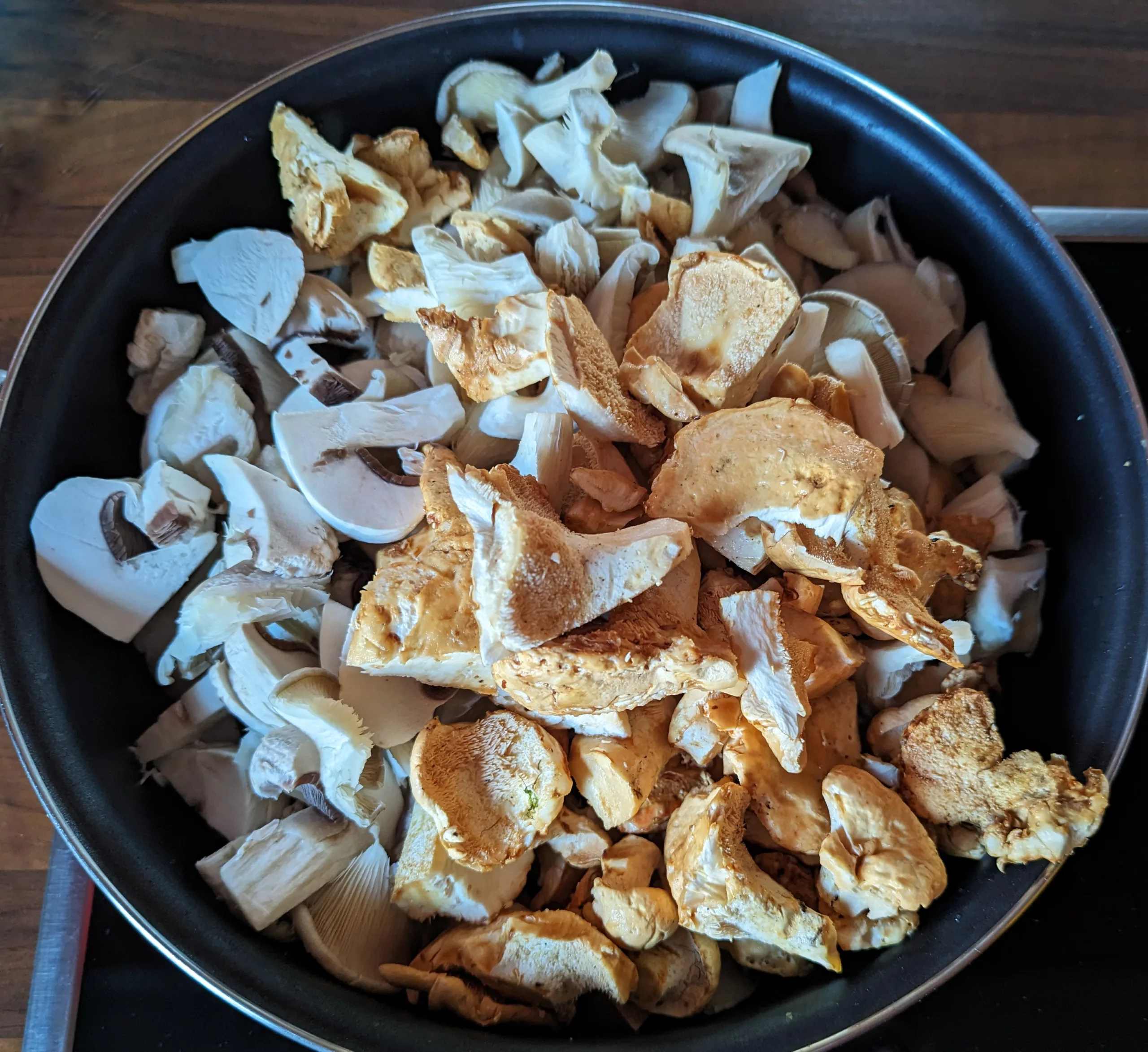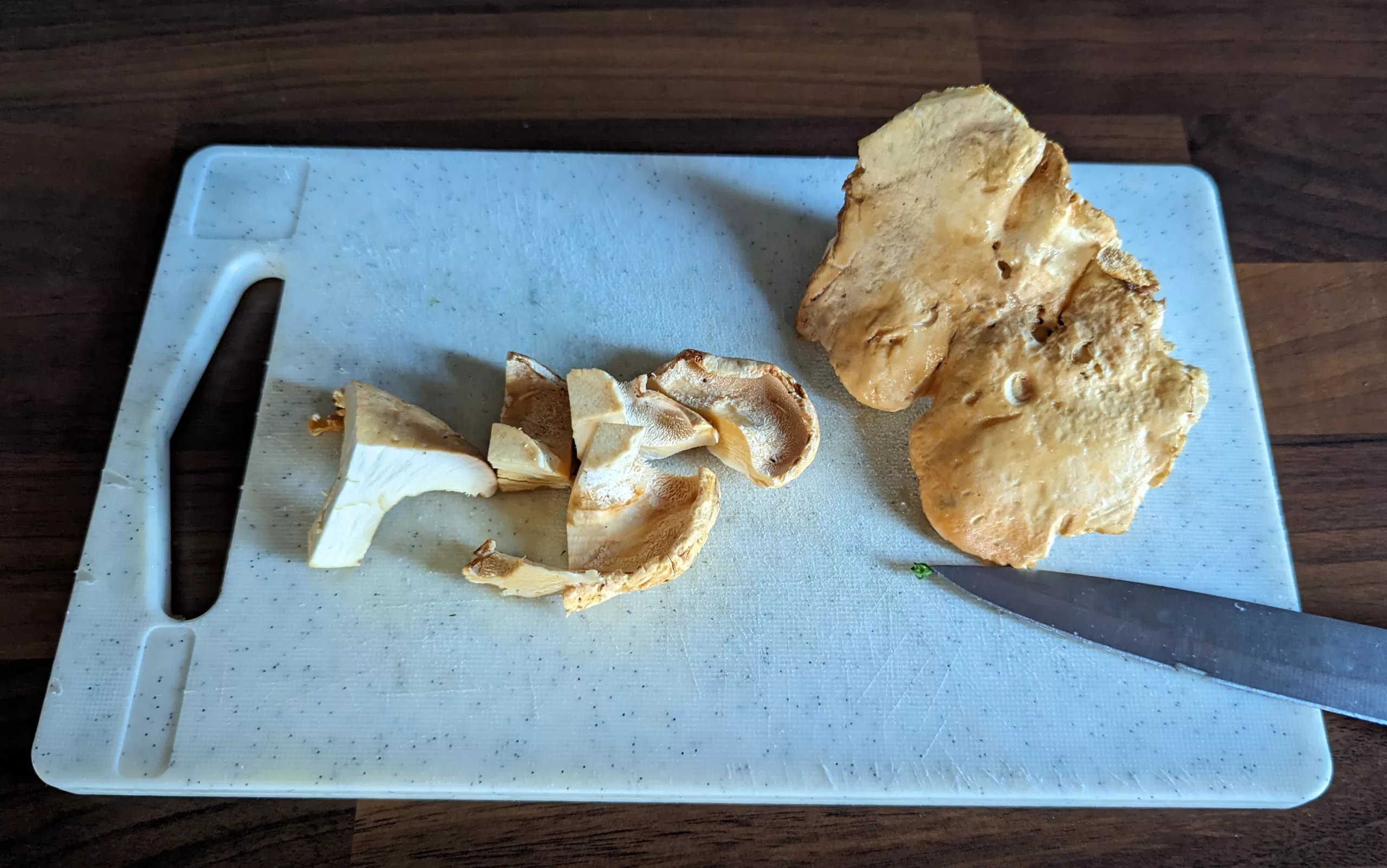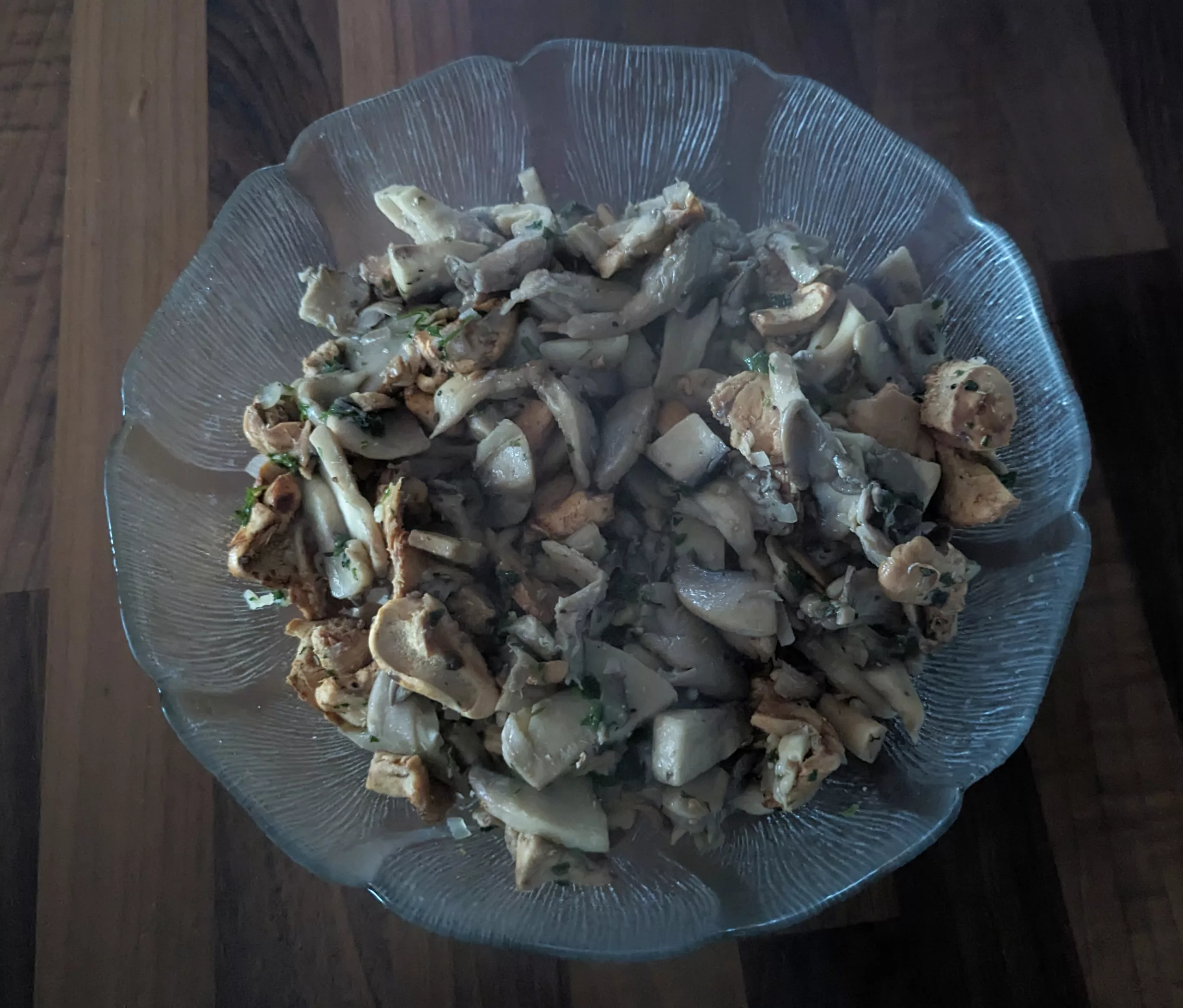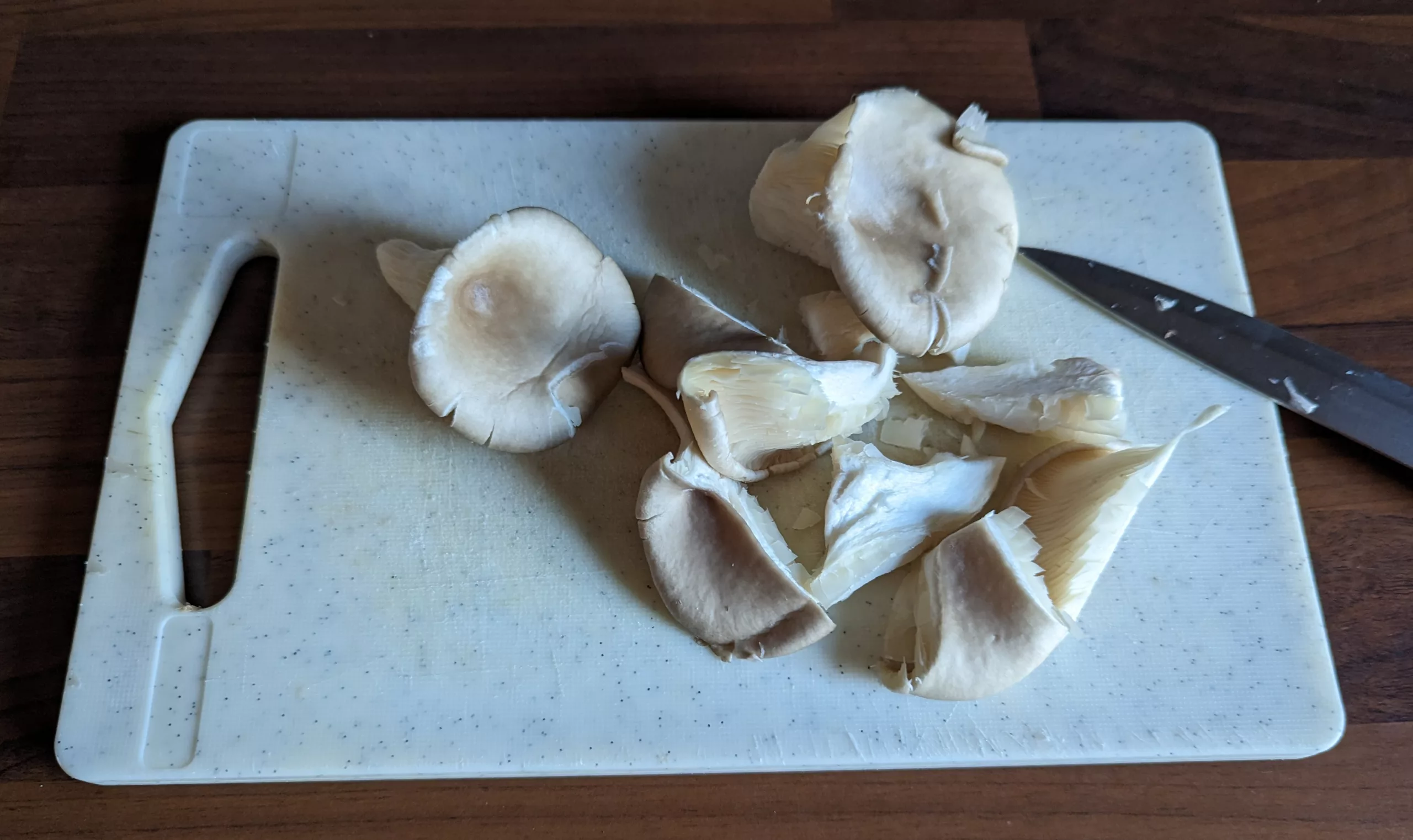 Puis, couper le pied des pleurotes et les tailler en 4. Les morceaux ne doivent pas être trop gros ni petits.
