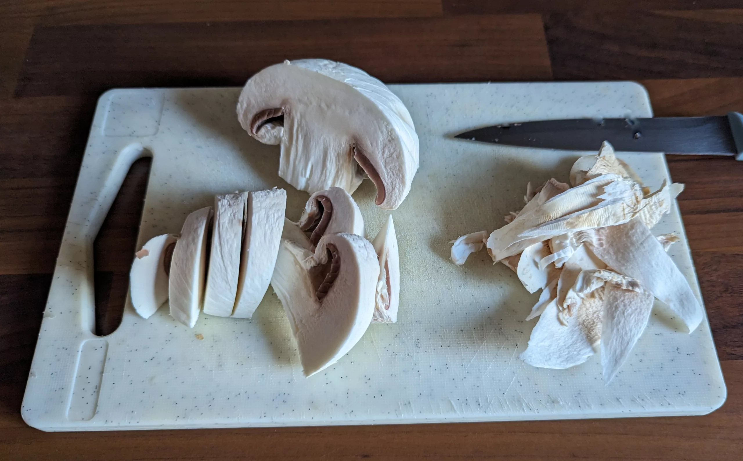 Commencer par brosser et nettoyer tous les champignons. Ensuite, couper le pied des champignons de Paris, enlever la peau et les couper en lamelles.